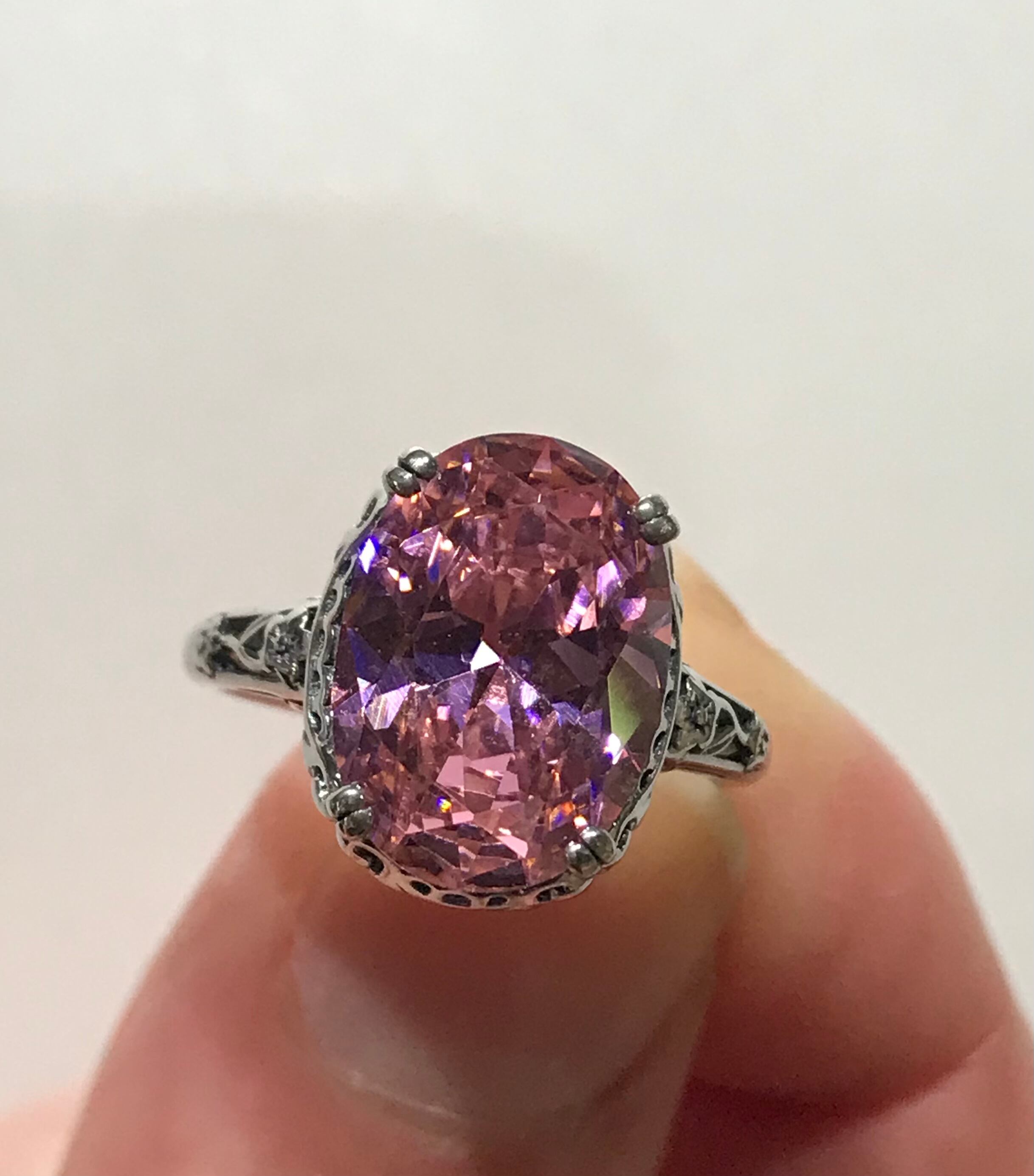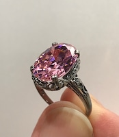 このフルカットOval Pink Cubic Zirconia (CZ)は屋外の光では淡いピンク色で、屋内照明の下ではより濃いピンク色です。