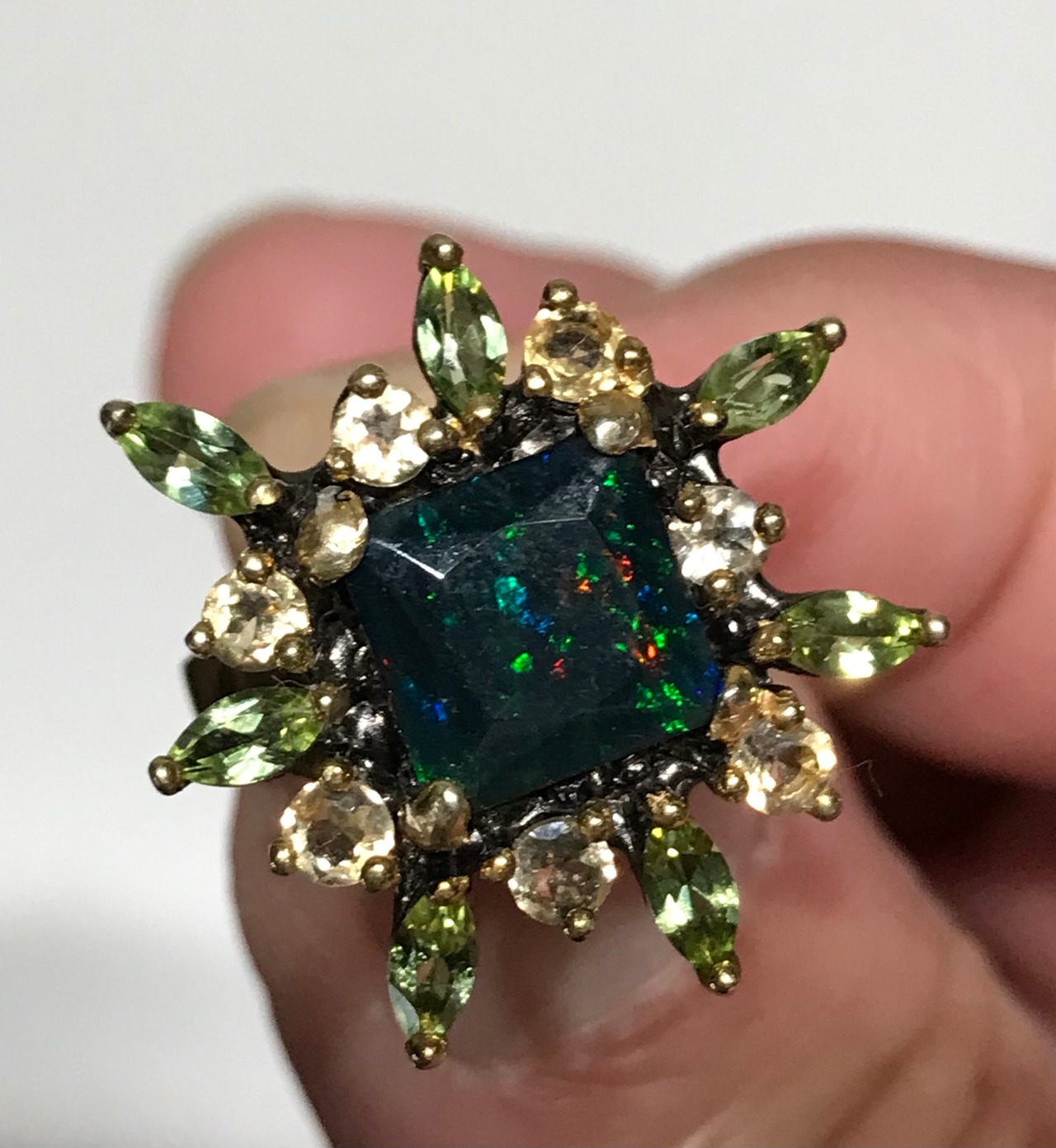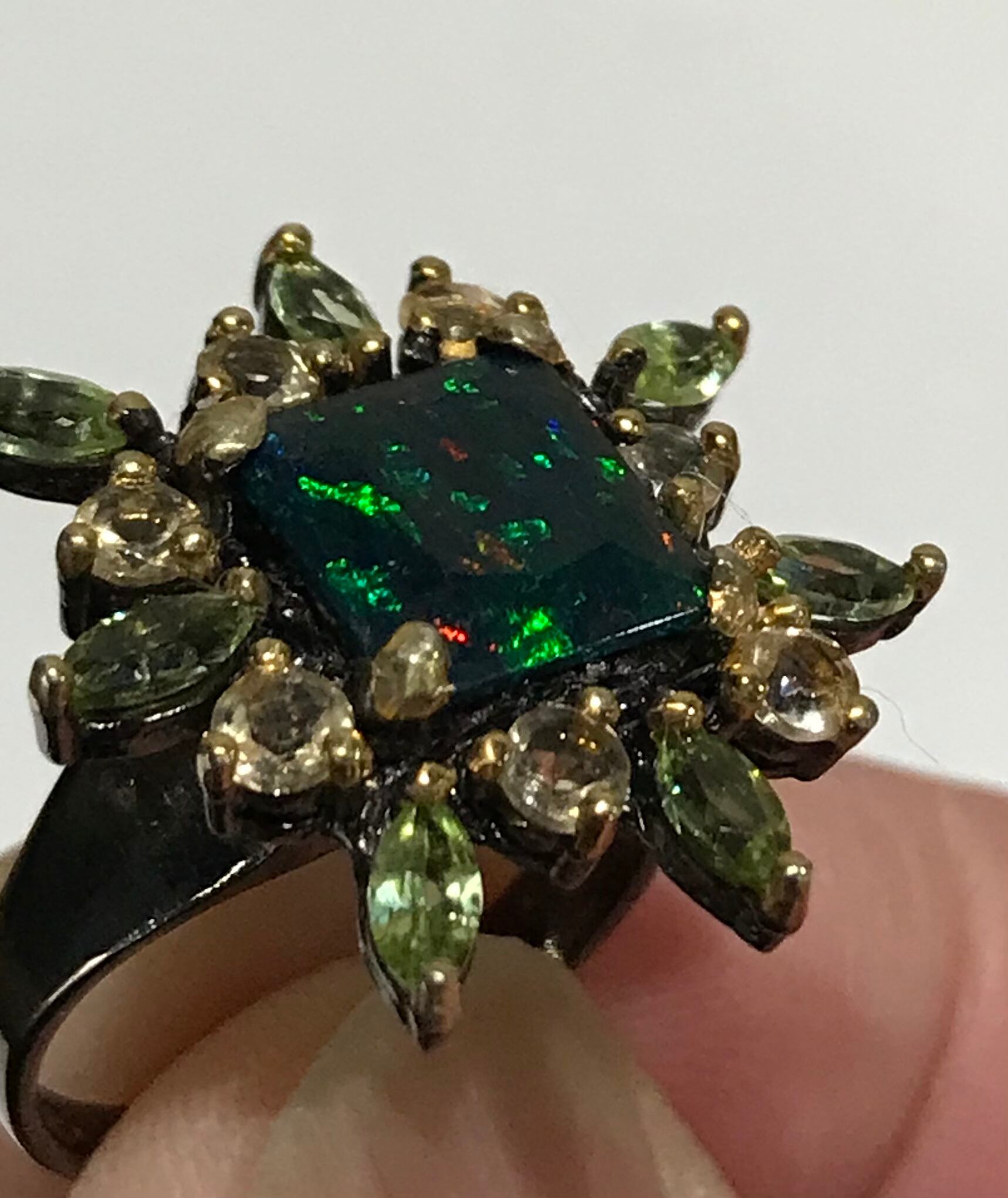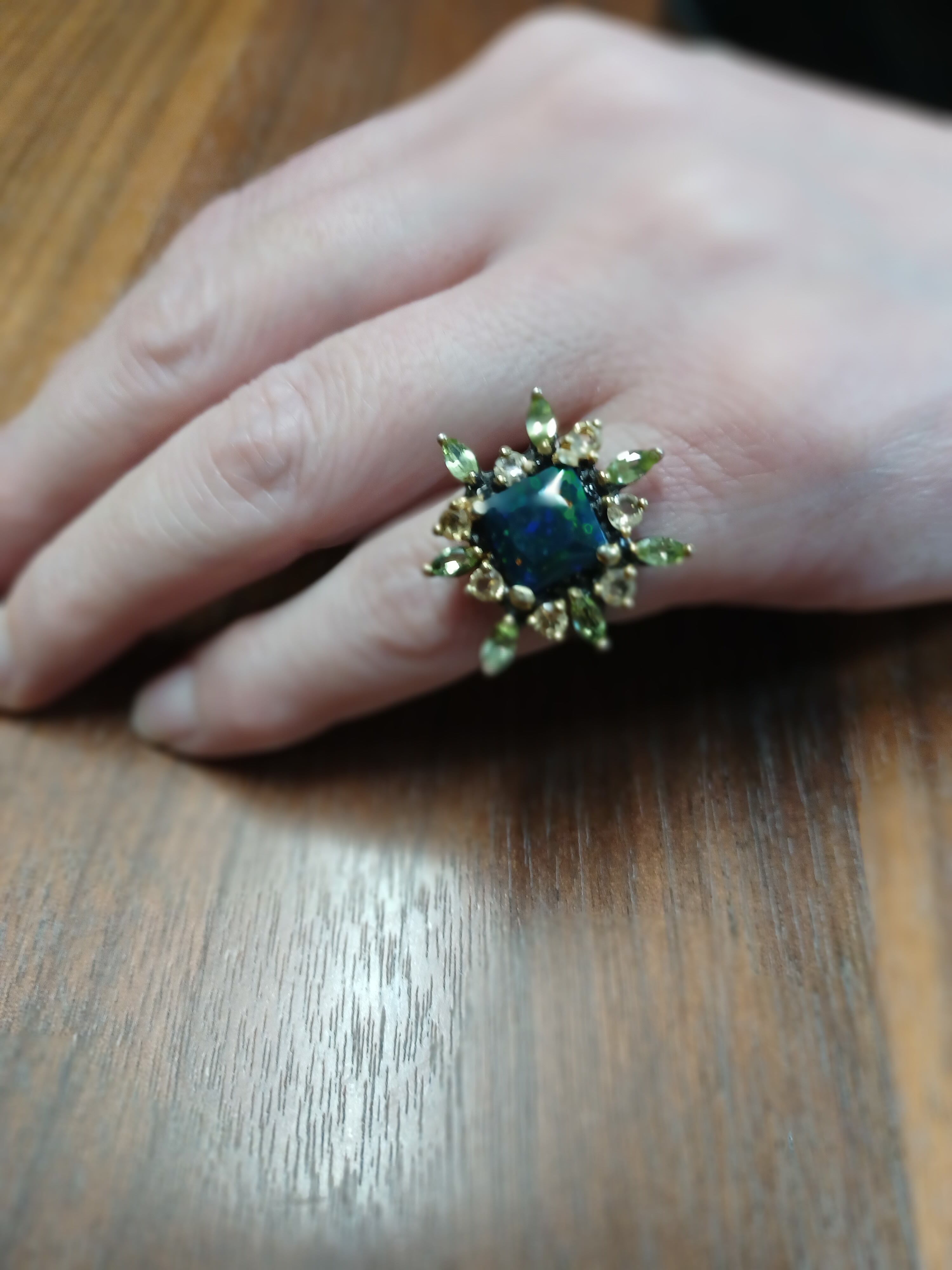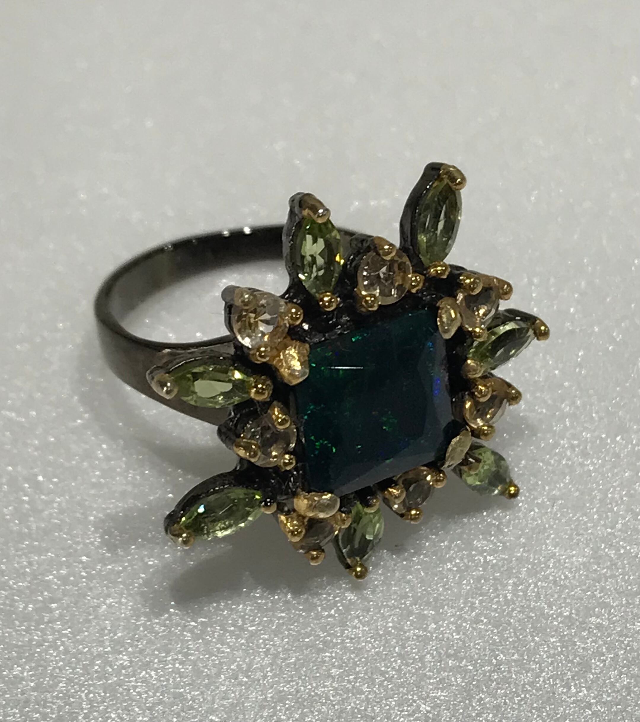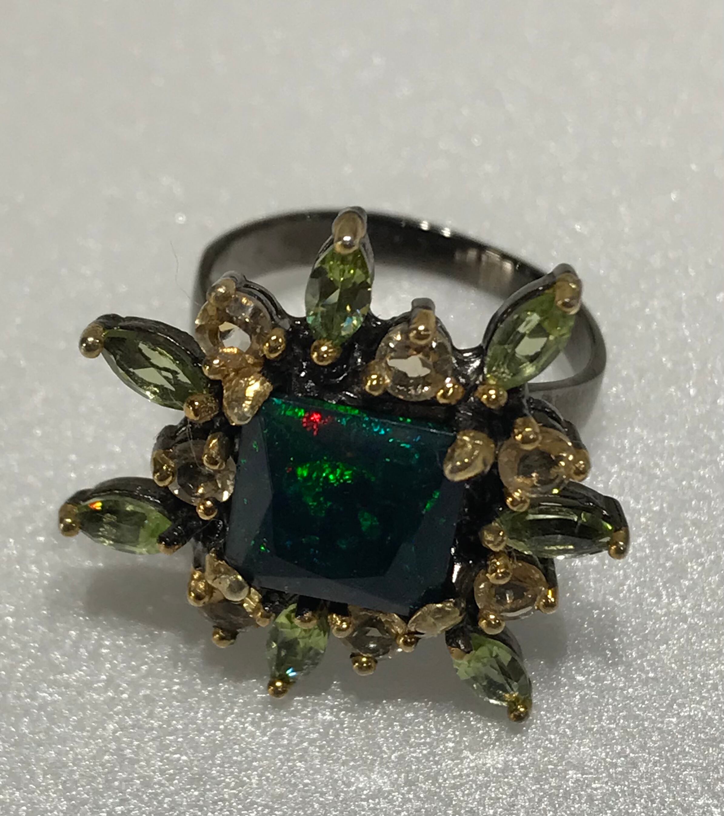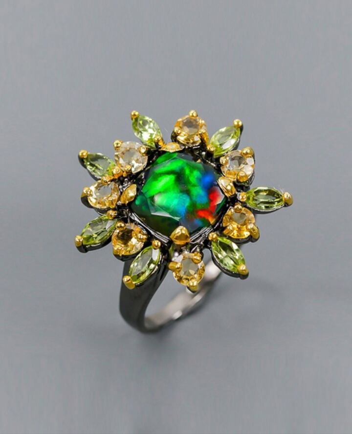 リングは、シトリンとペリドットの宝石で囲まれた925Sterling silverと天然の宝石Black Opalで作られています。