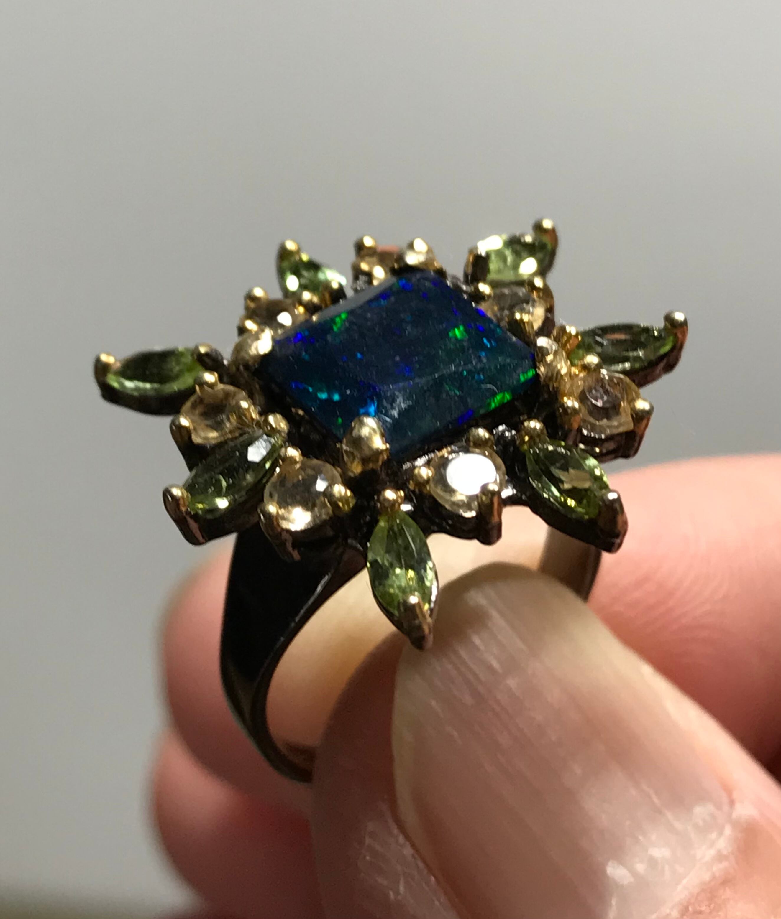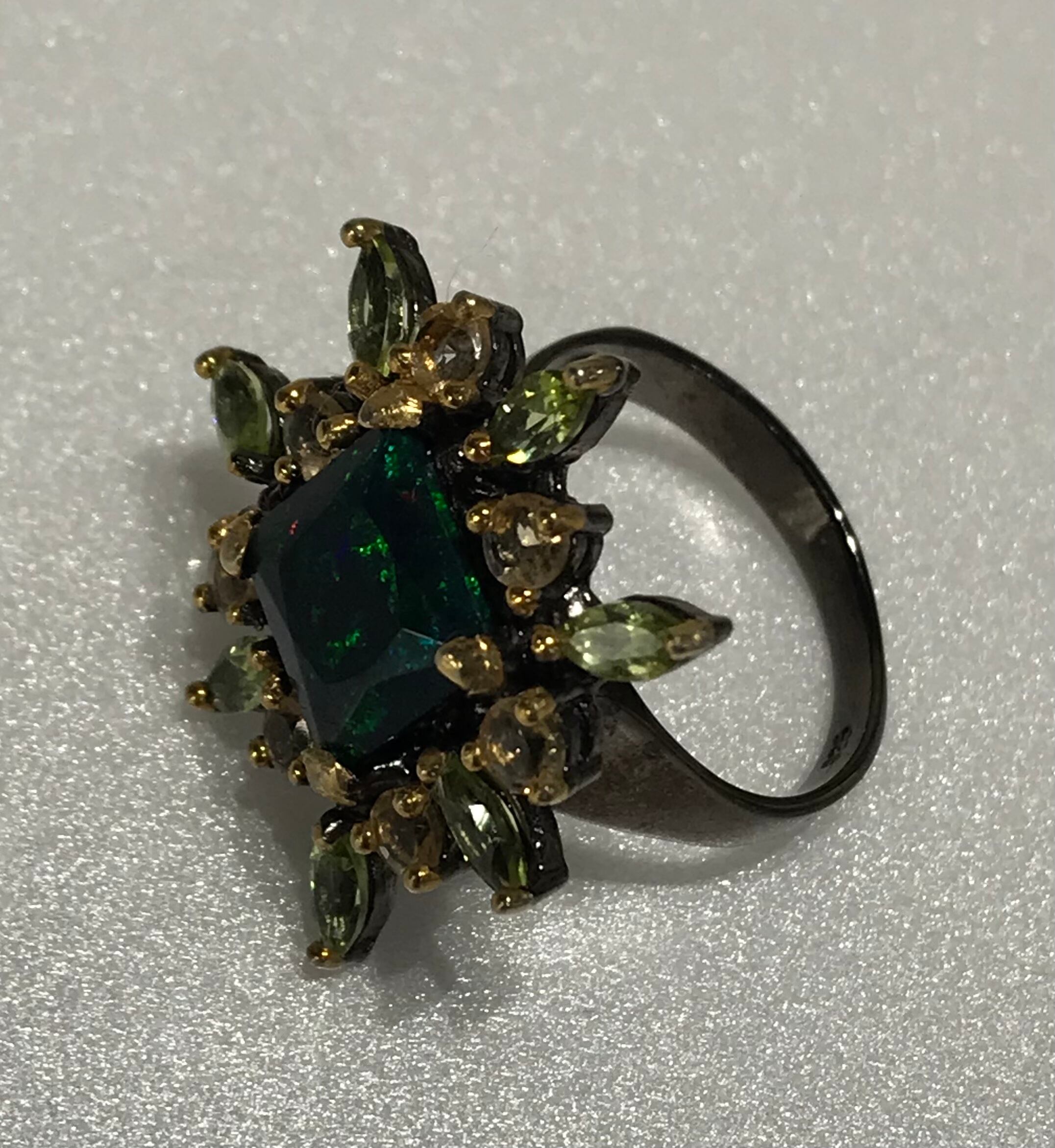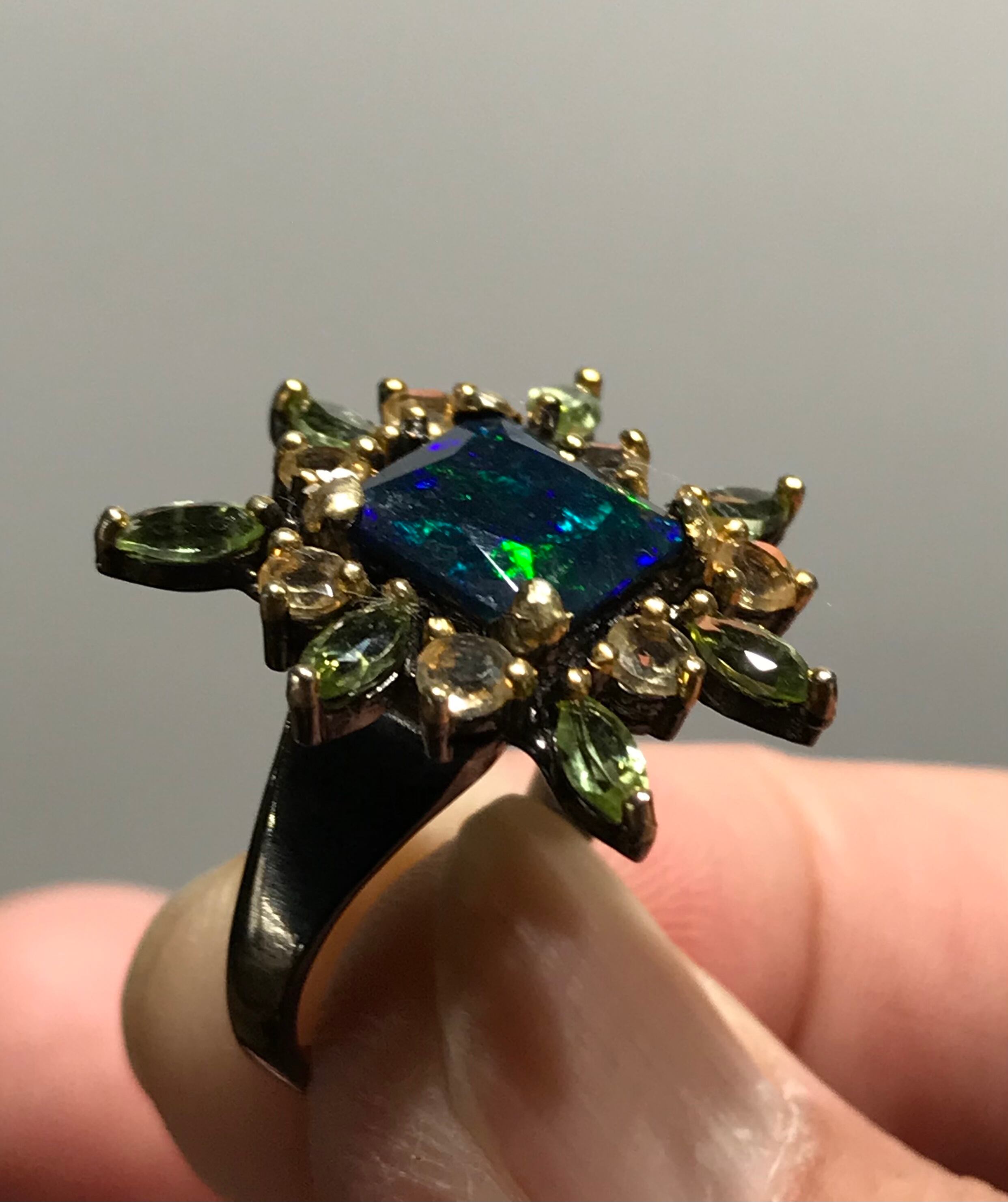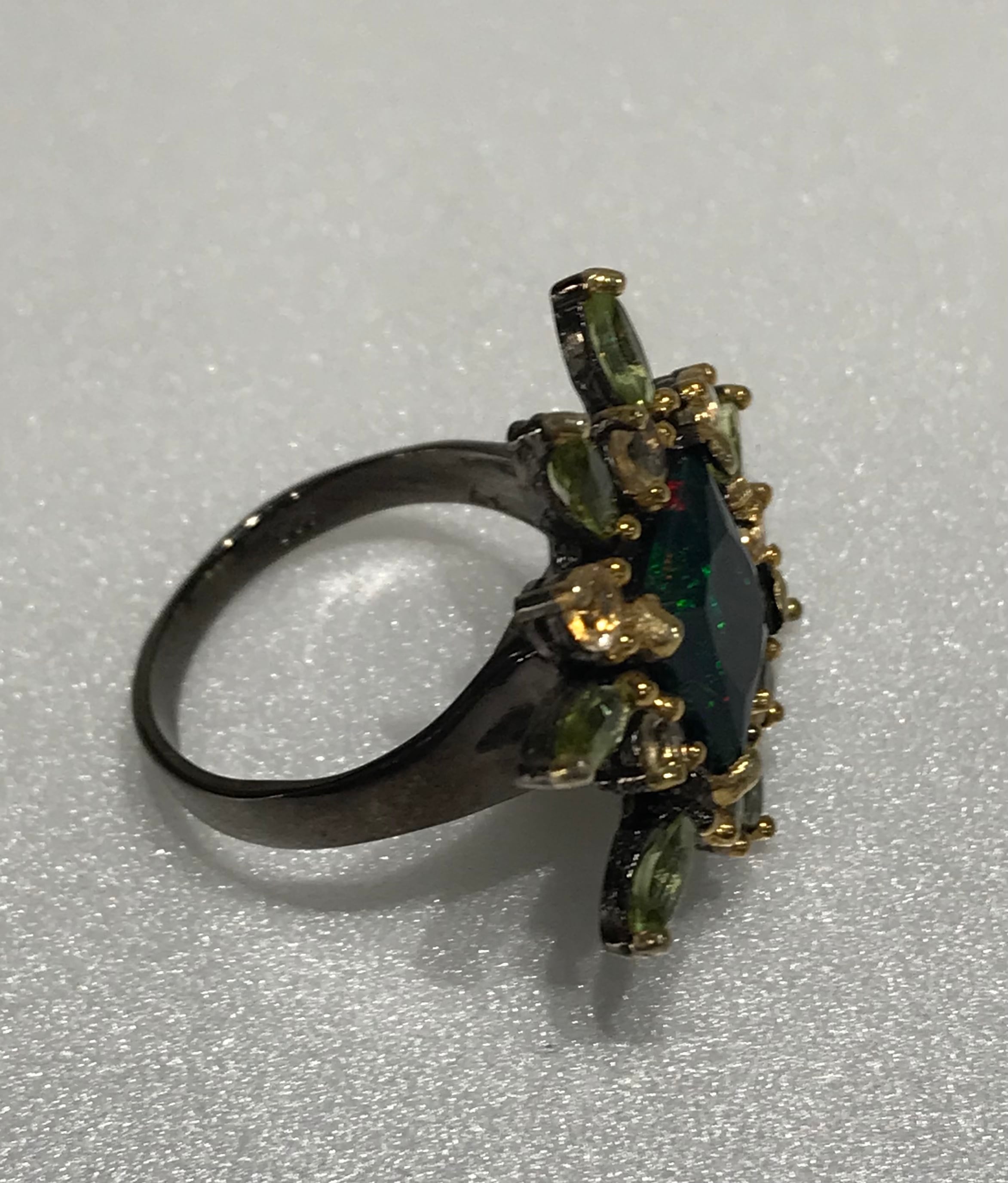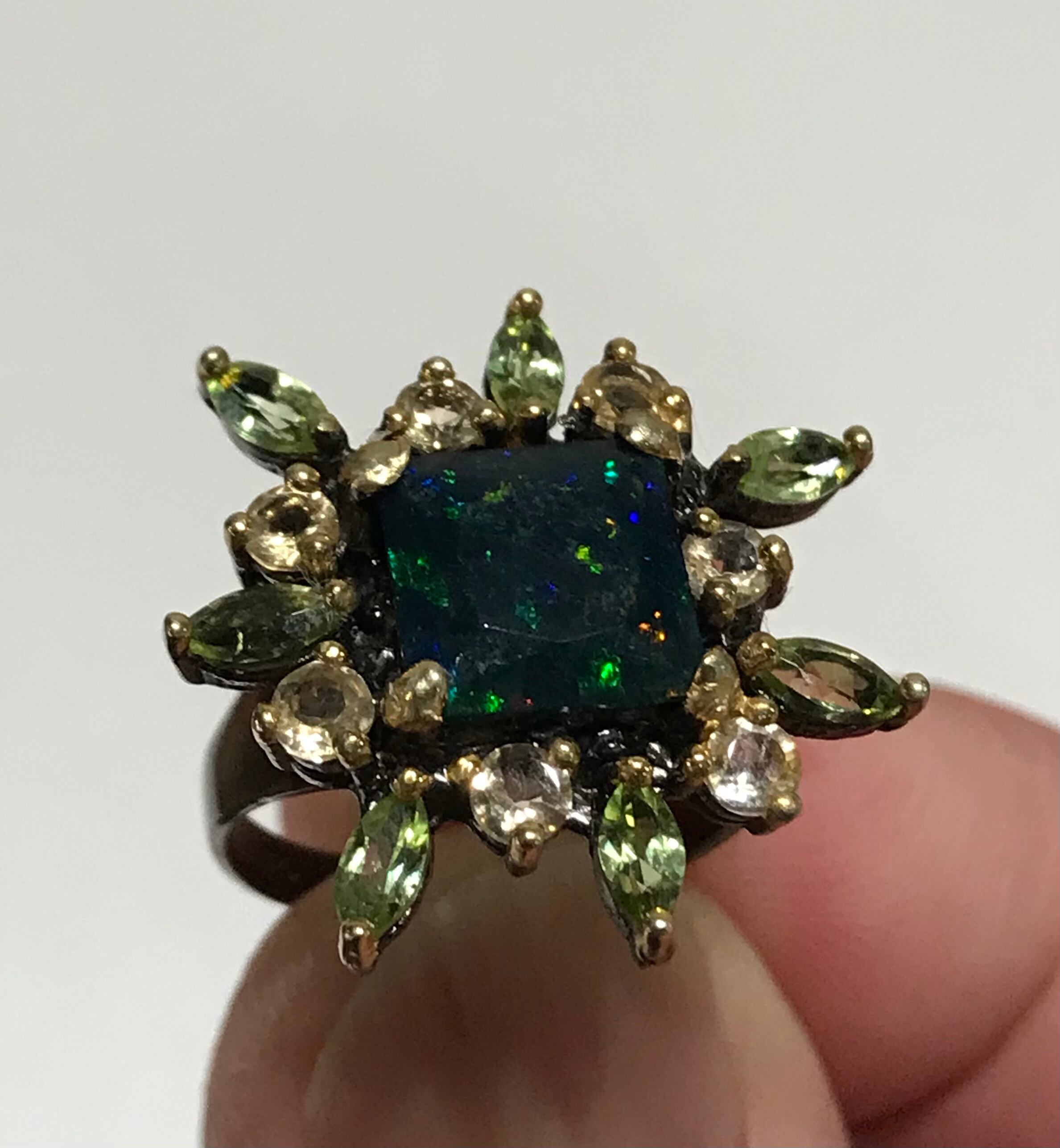 リングは、シトリンとペリドットの宝石で囲まれた925Sterling silverと天然の宝石Black Opalで作られています。