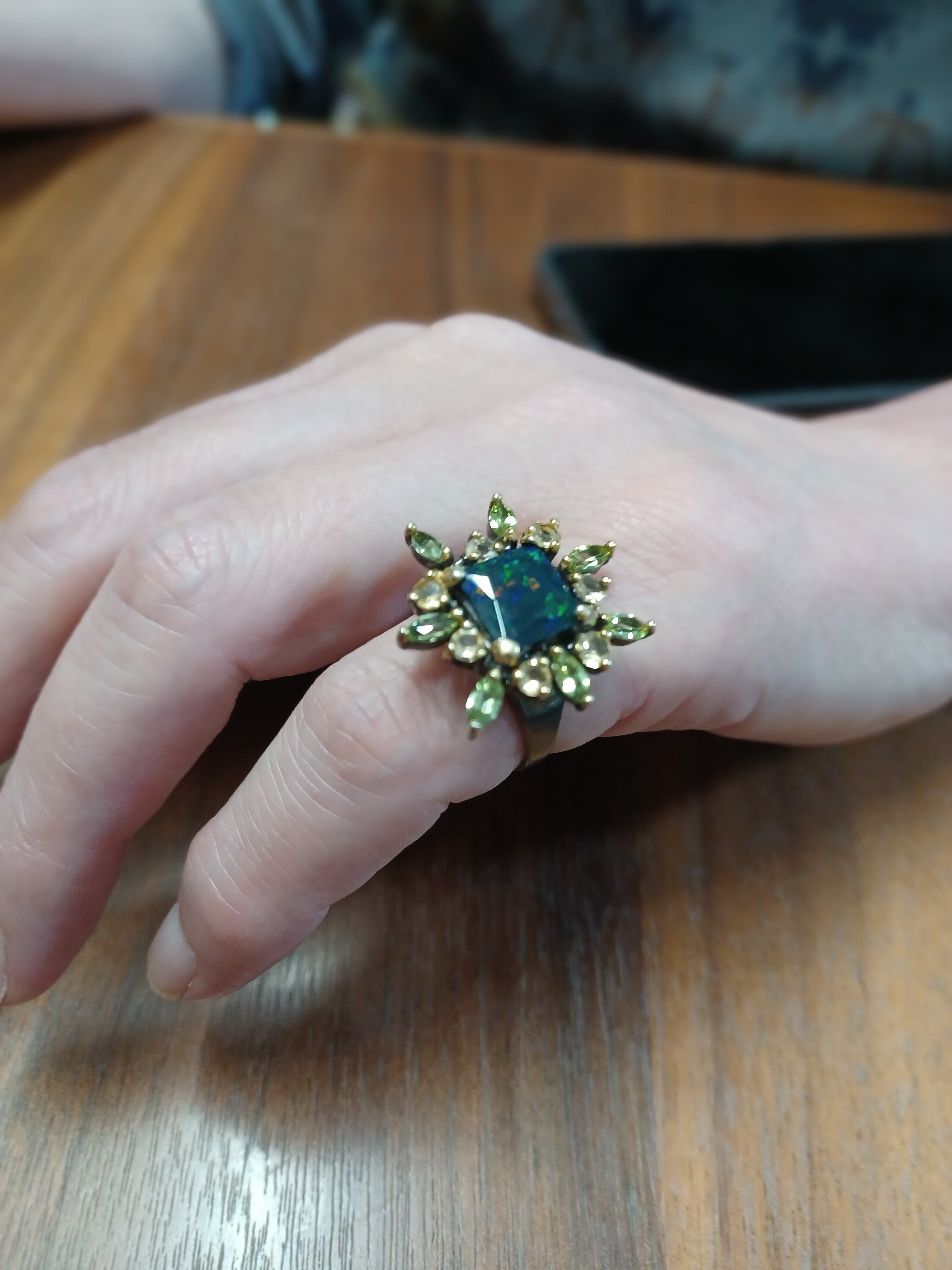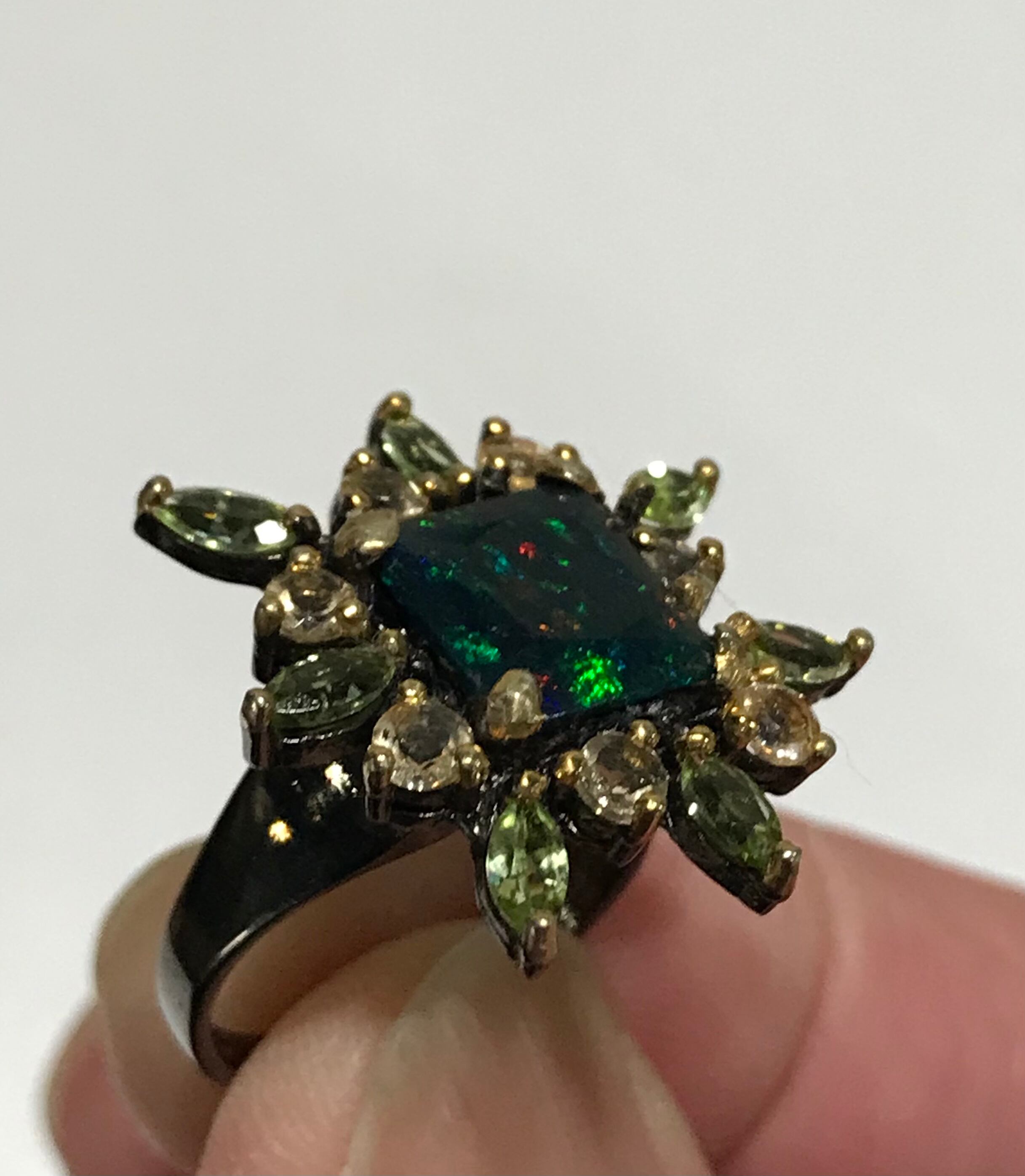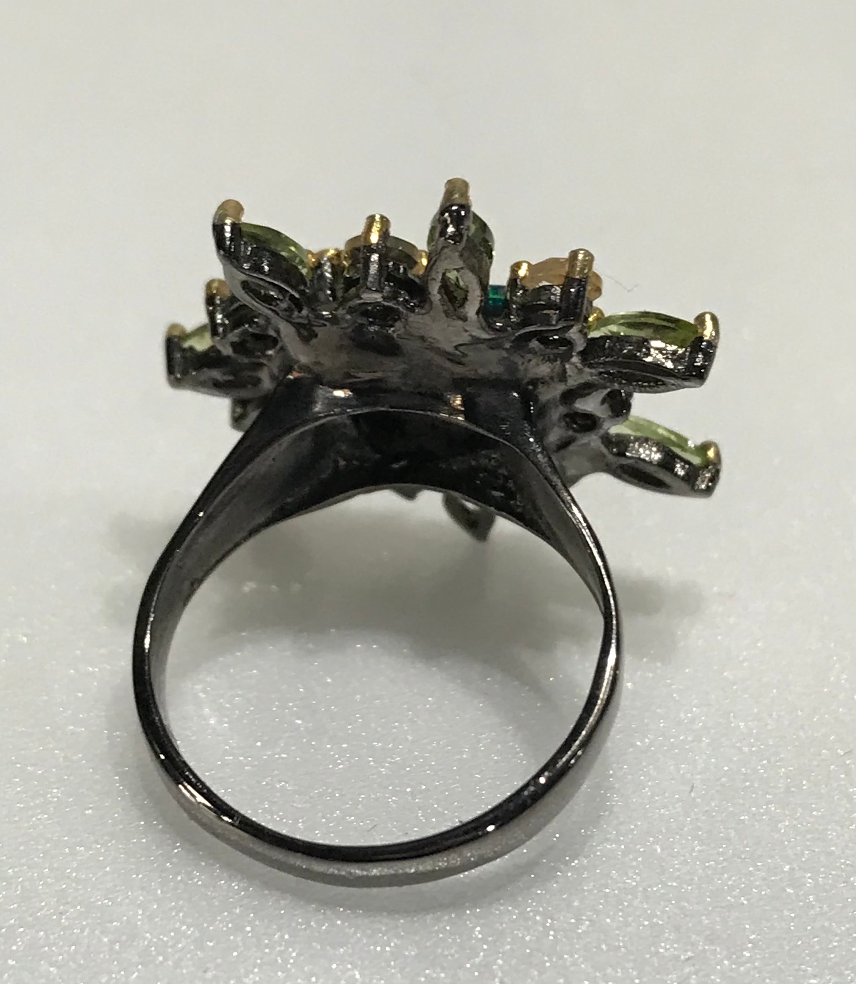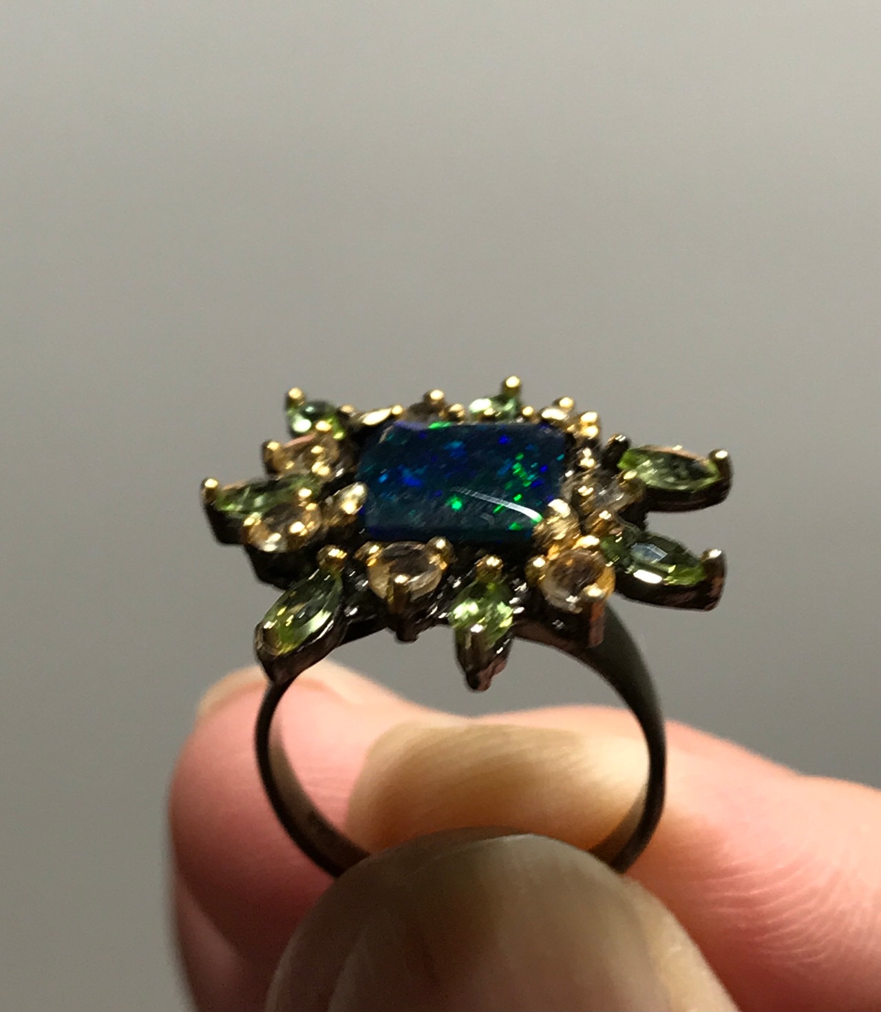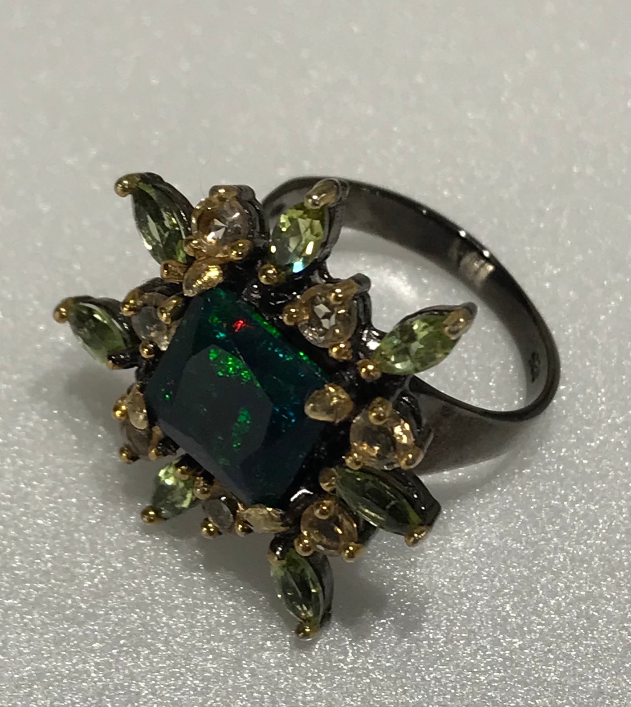 リングは、シトリンとペリドットの宝石で囲まれた925Sterling silverと天然の宝石Black Opalで作られています。