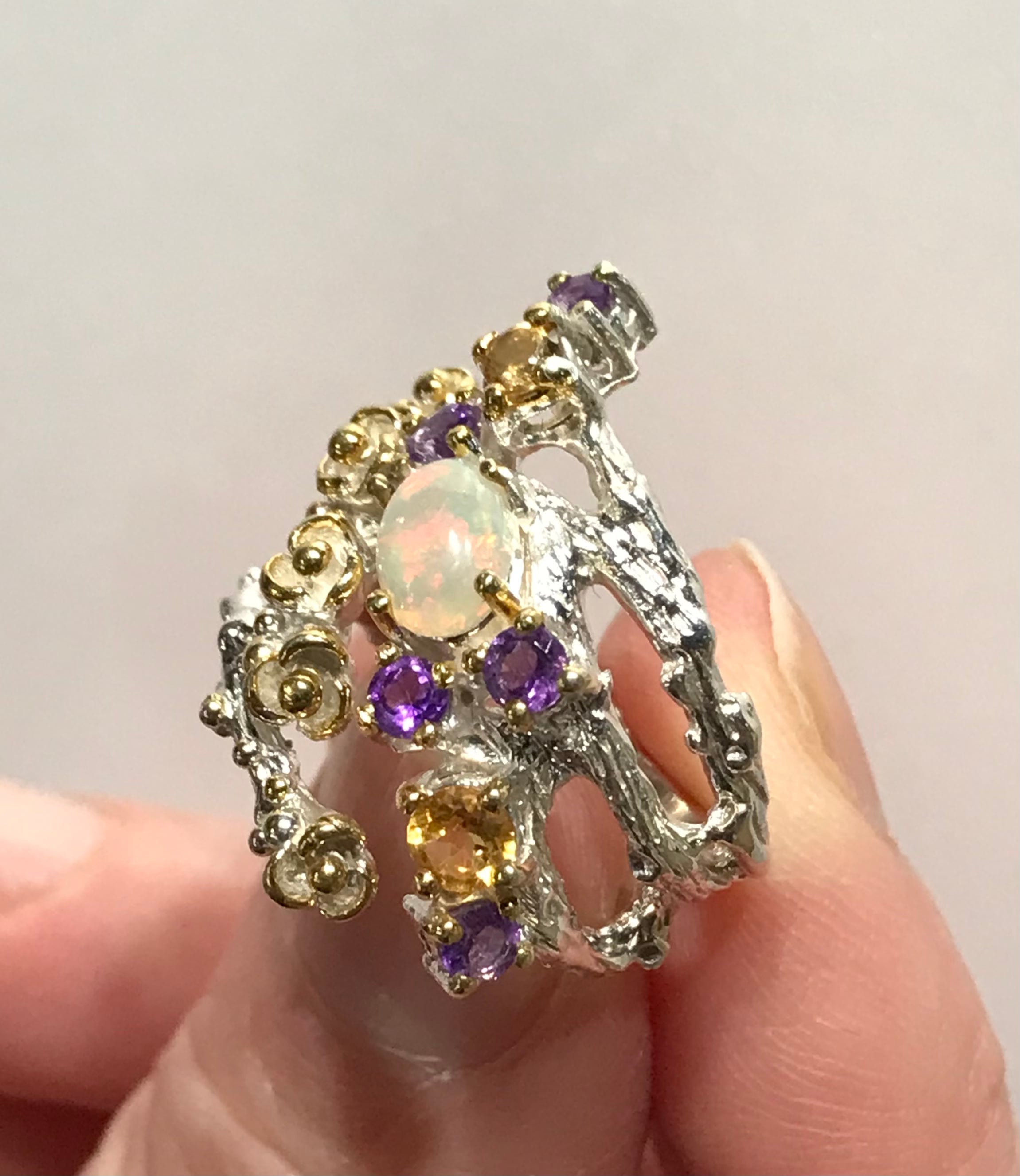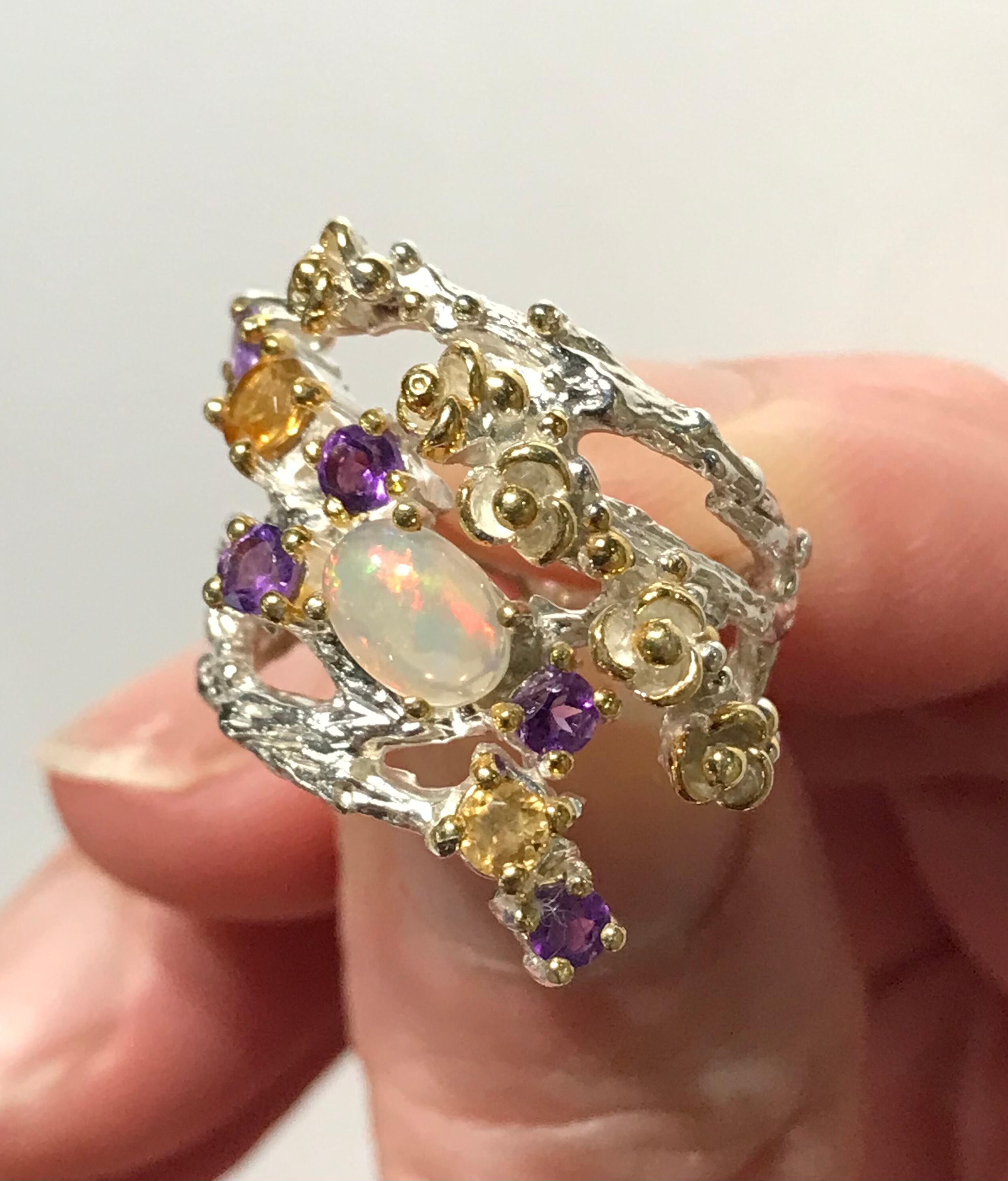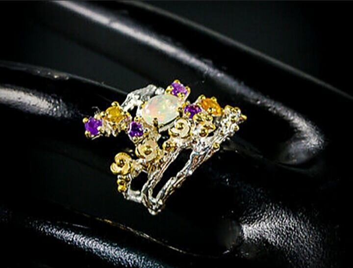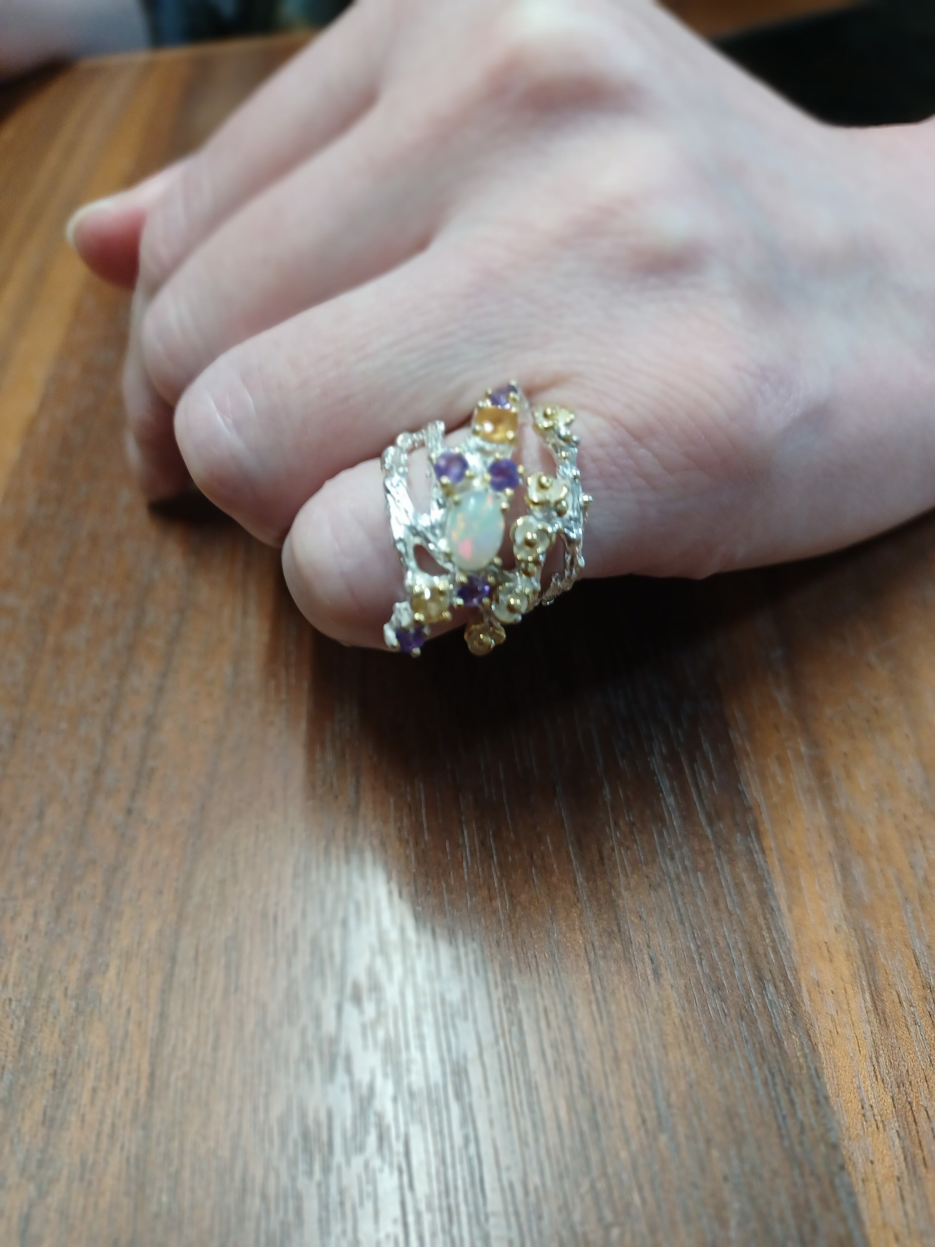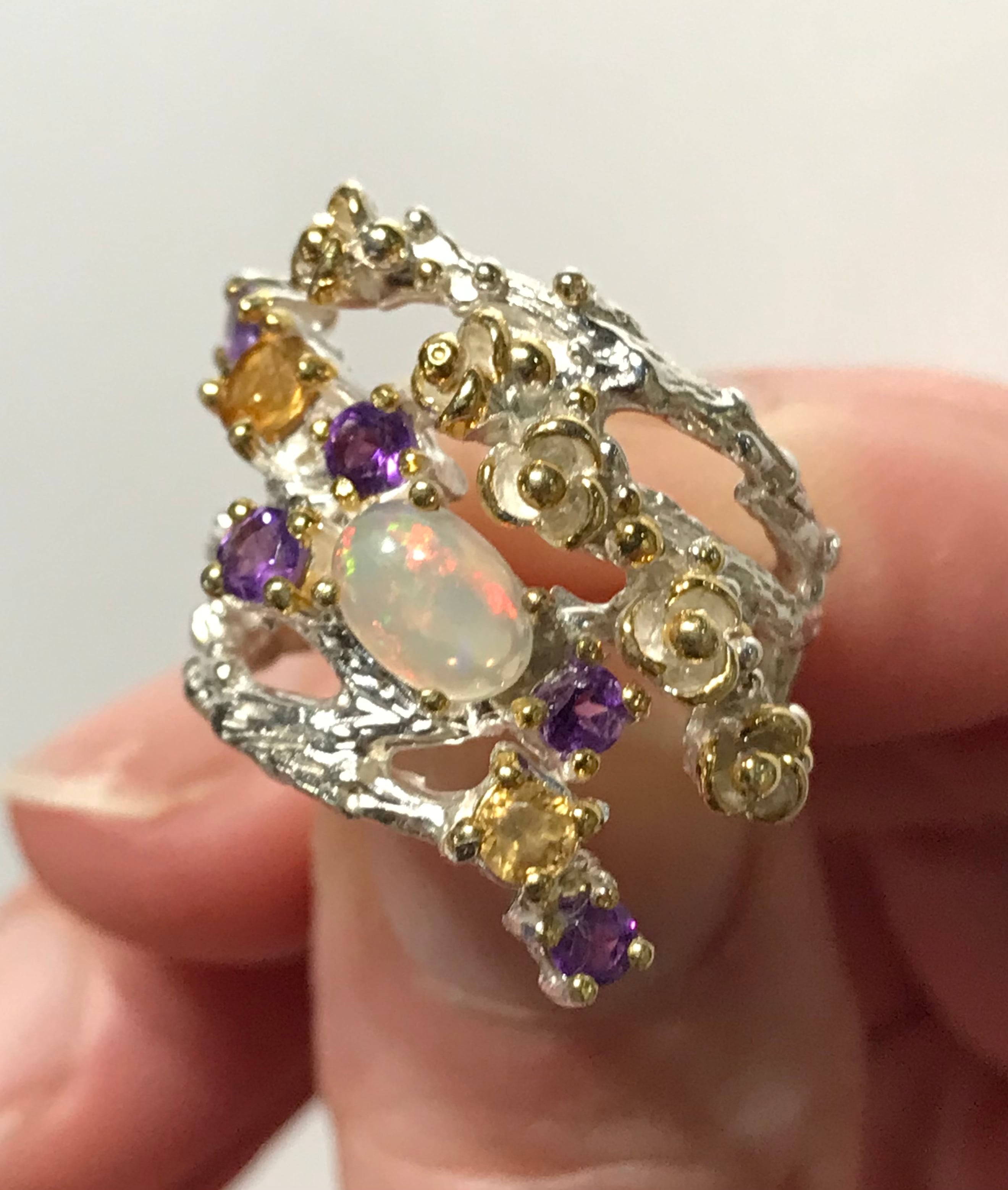 リングは、925Sterling silverと天然の宝石のOval(楕円形)Rainbow Opalとアメジストで作られています。