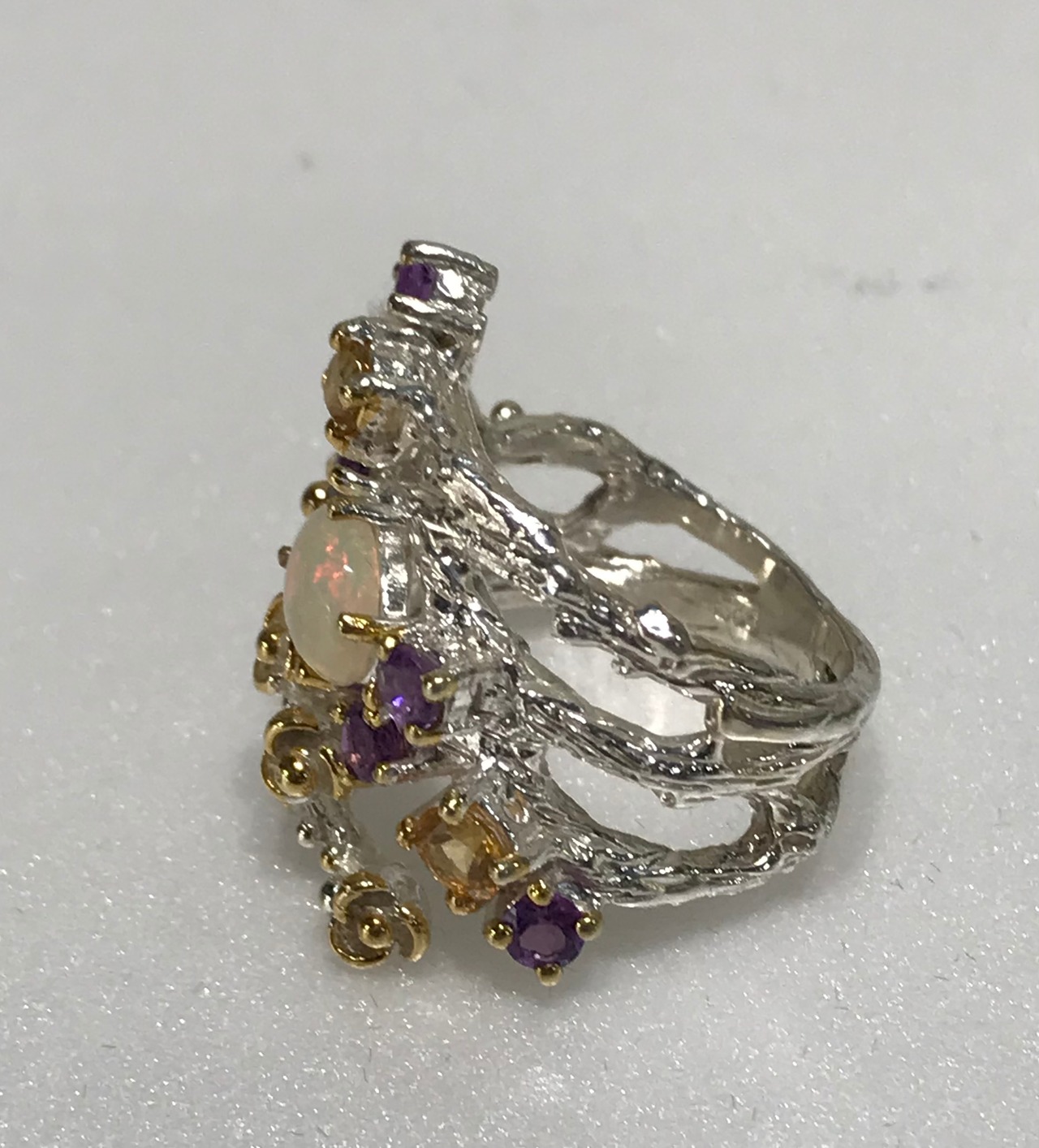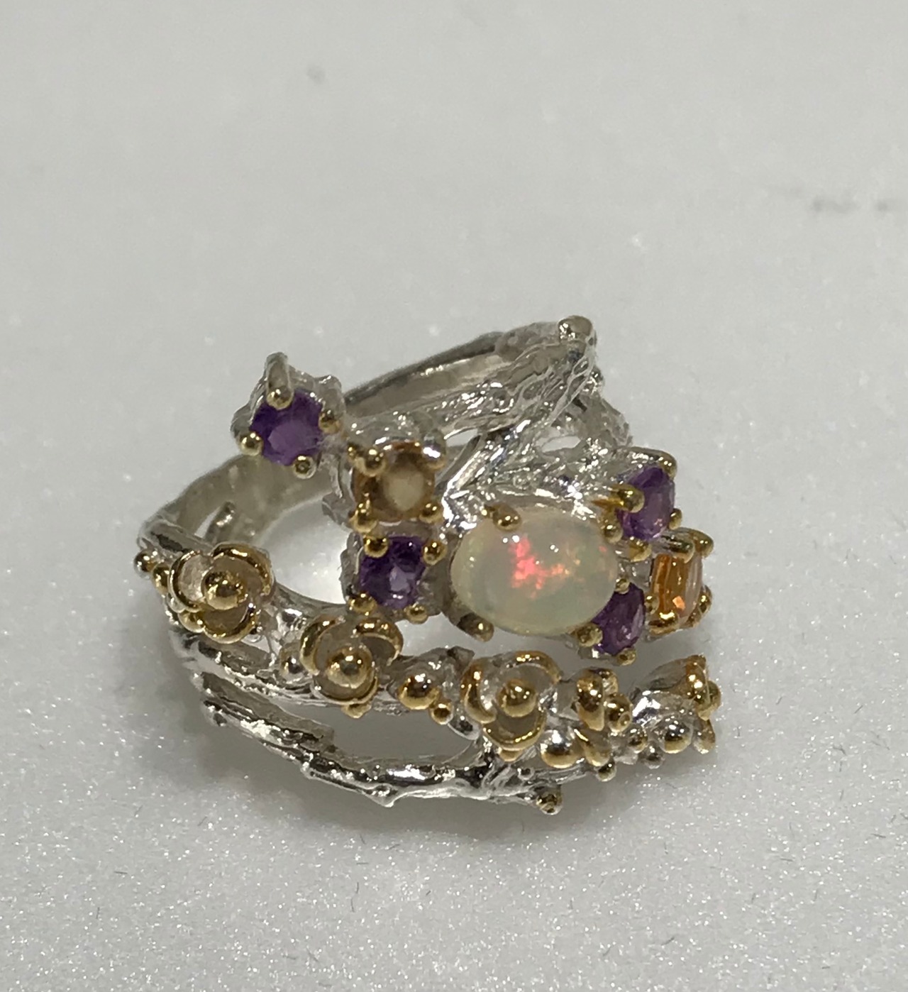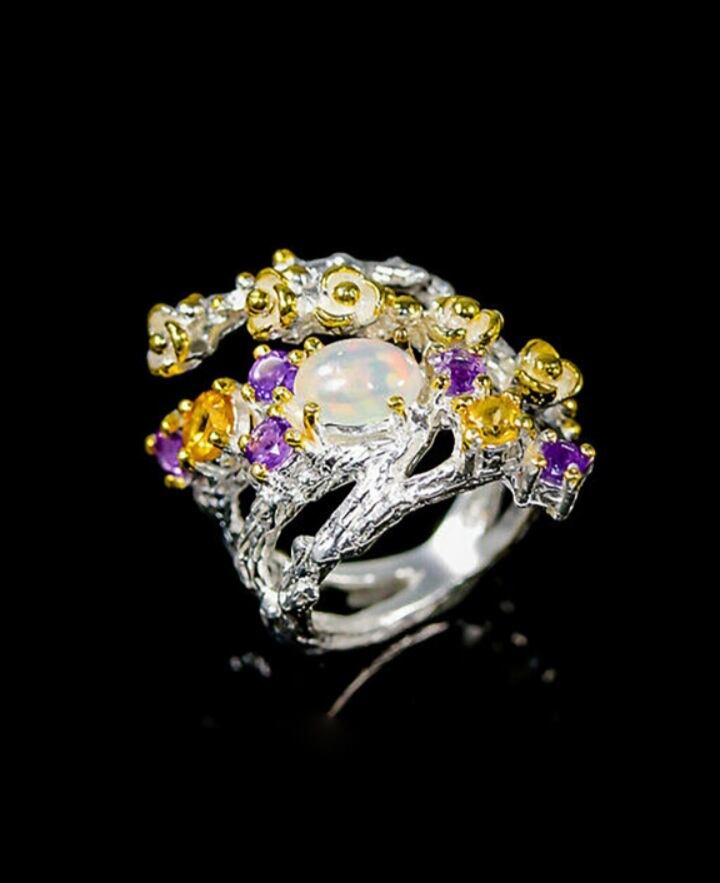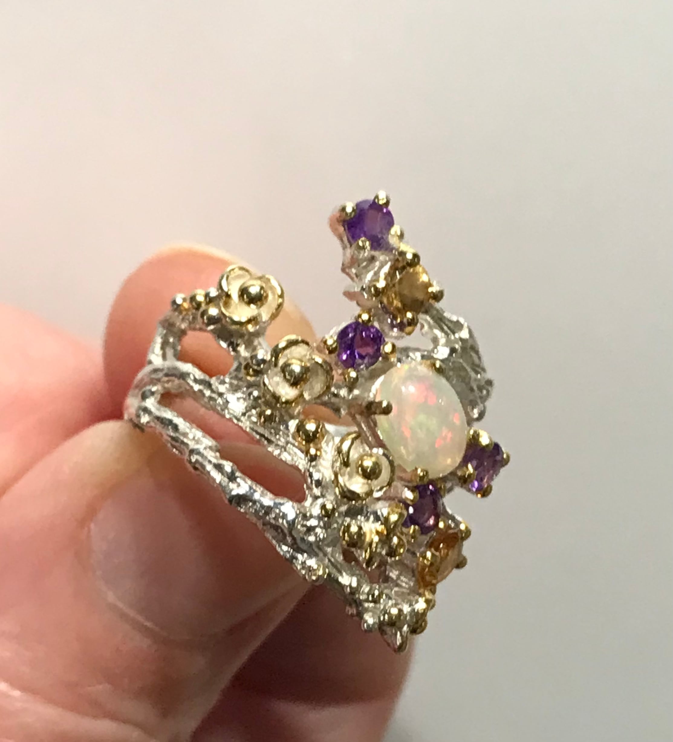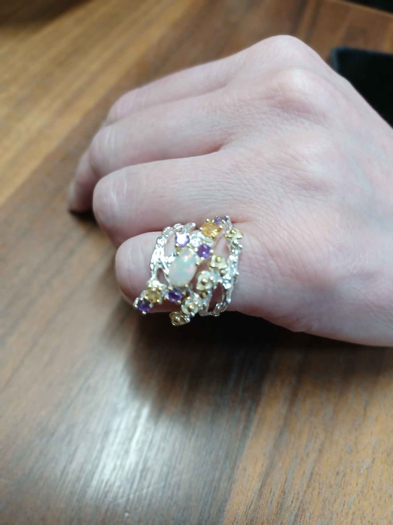 リングは、925Sterling silverと天然の宝石のOval(楕円形)Rainbow Opalとアメジストで作られています。