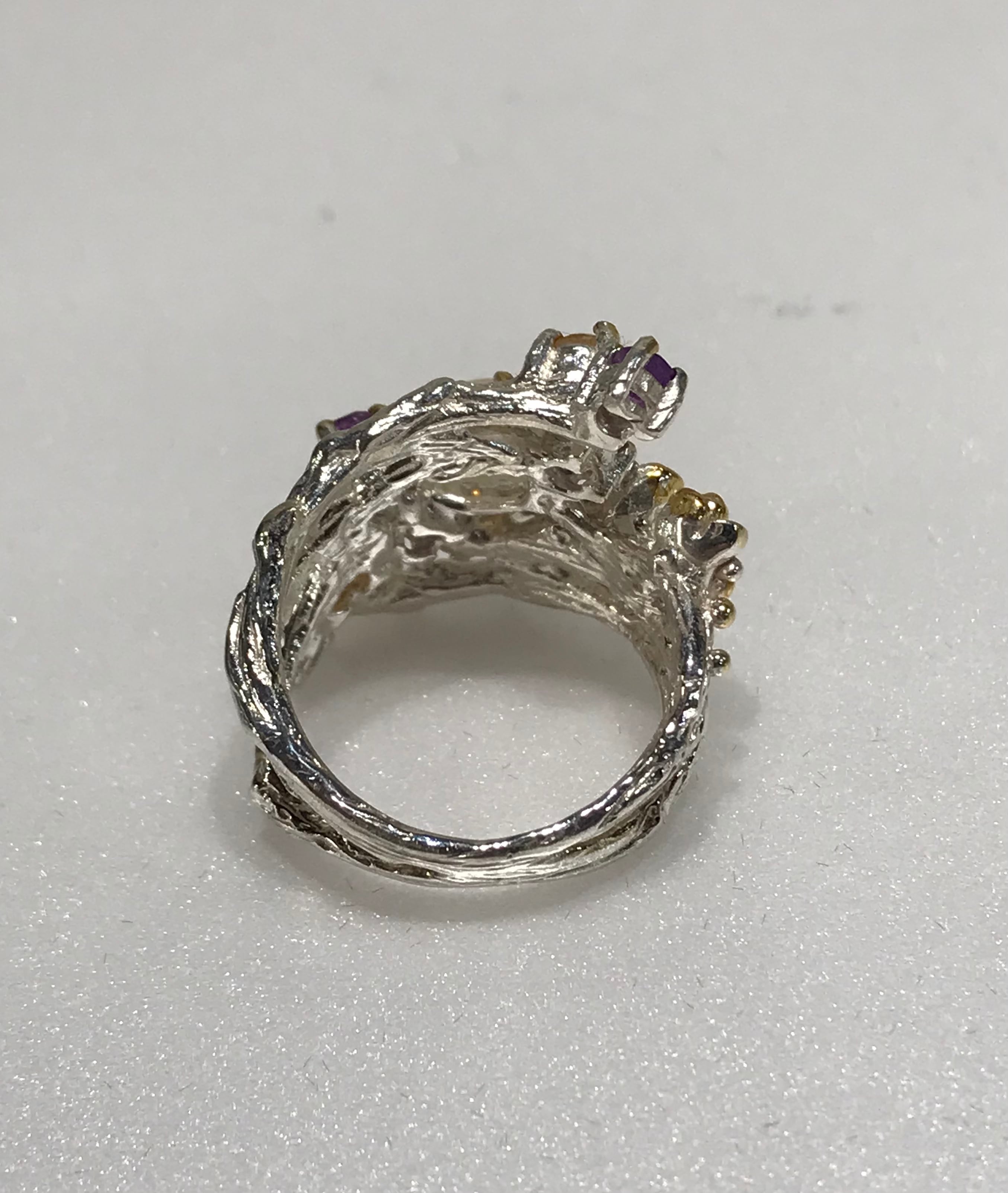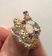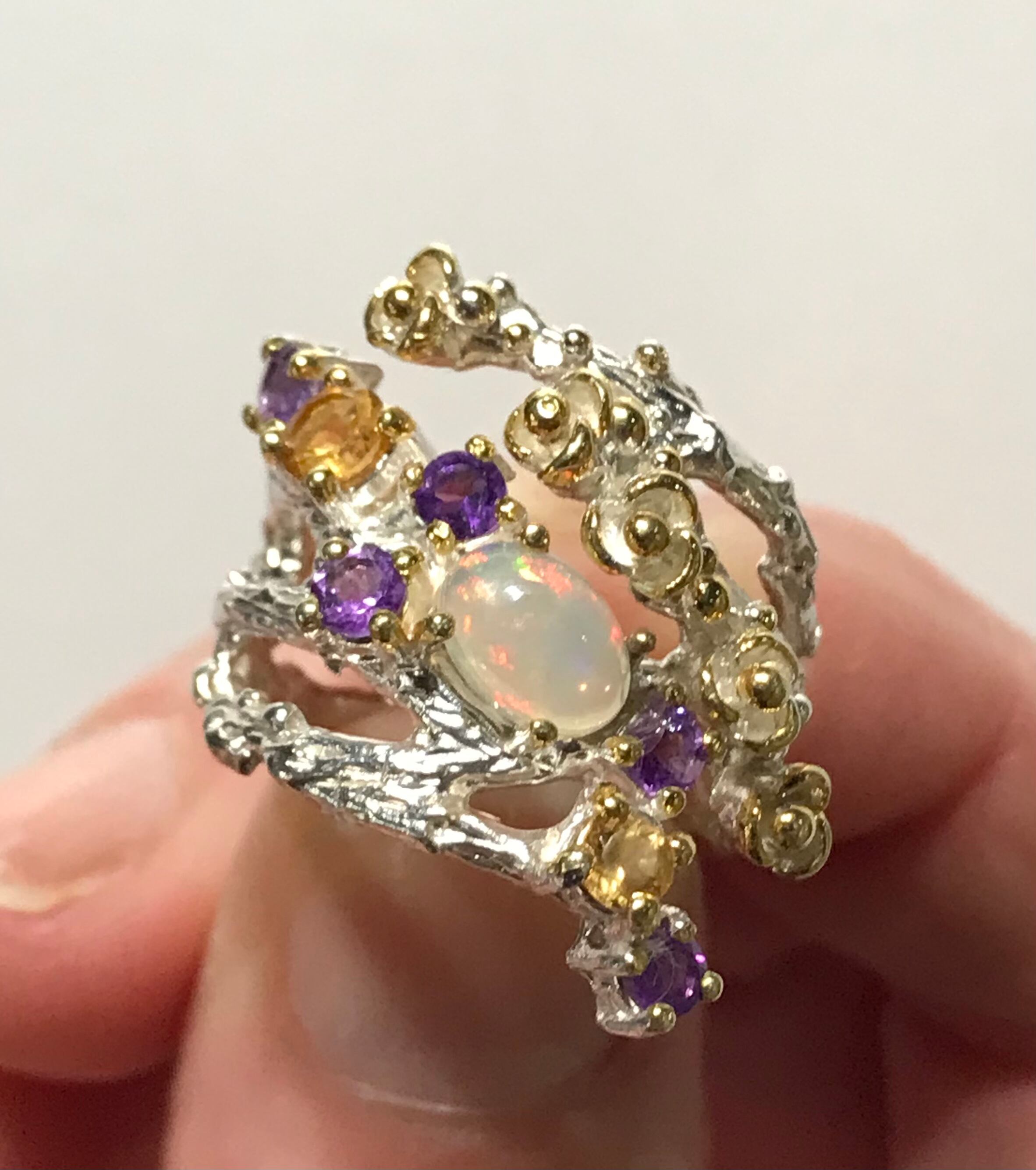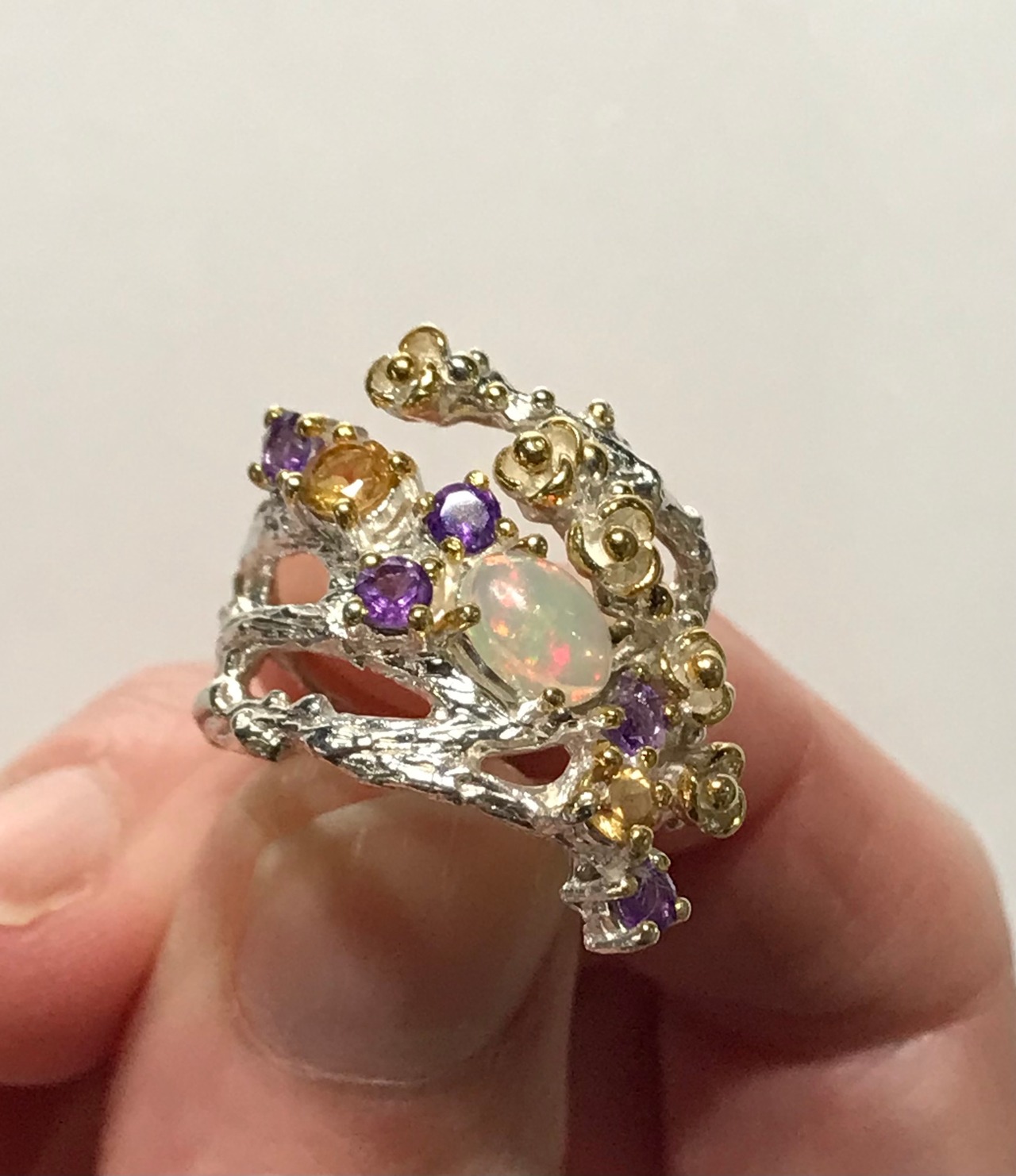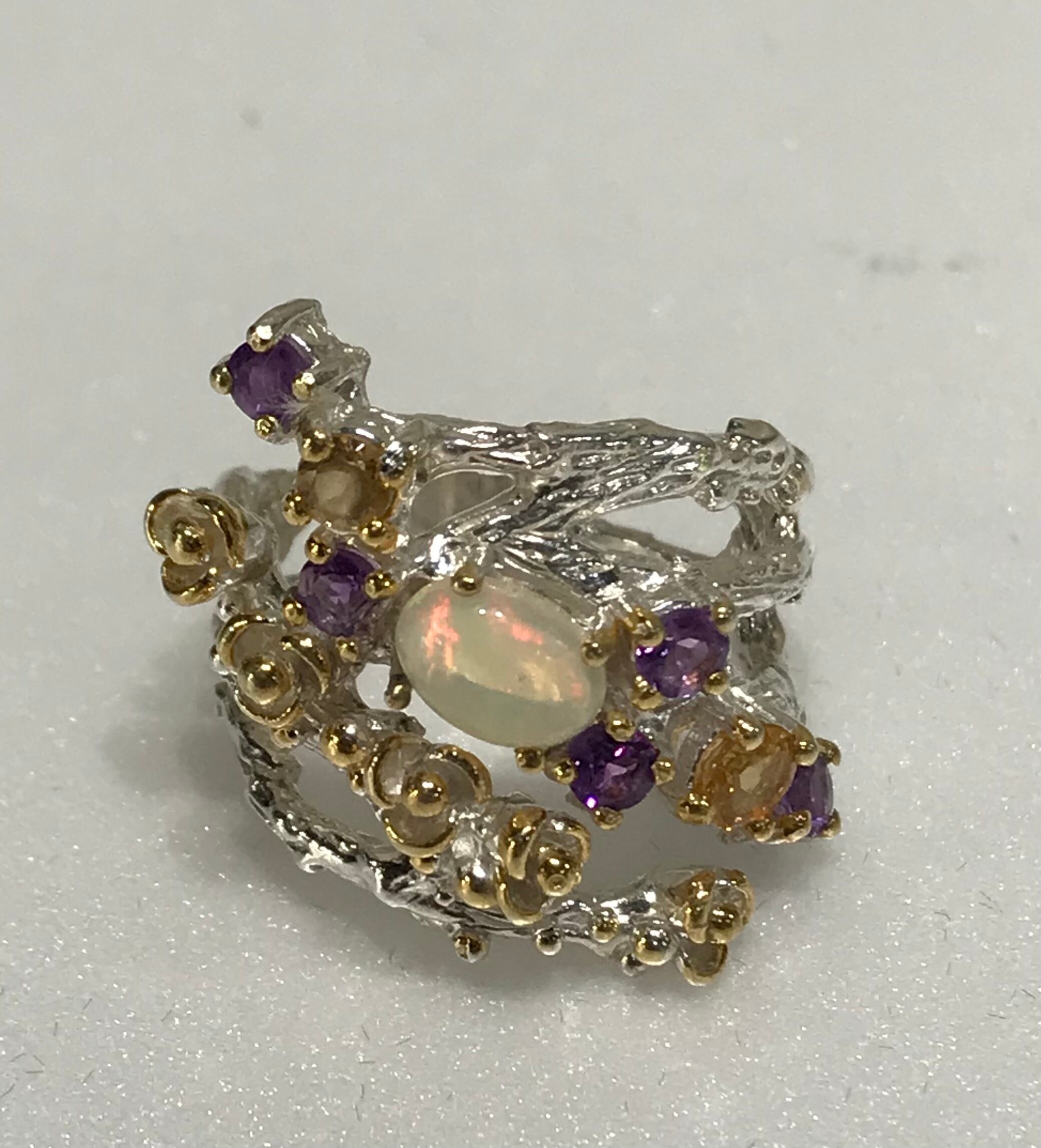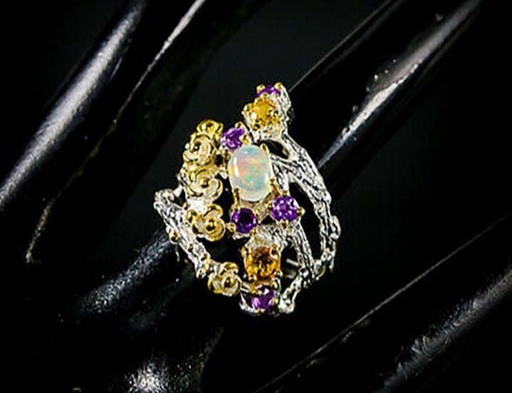 リングは、925Sterling silverと天然の宝石のOval(楕円形)Rainbow Opalとアメジストで作られています。